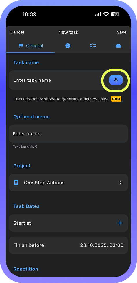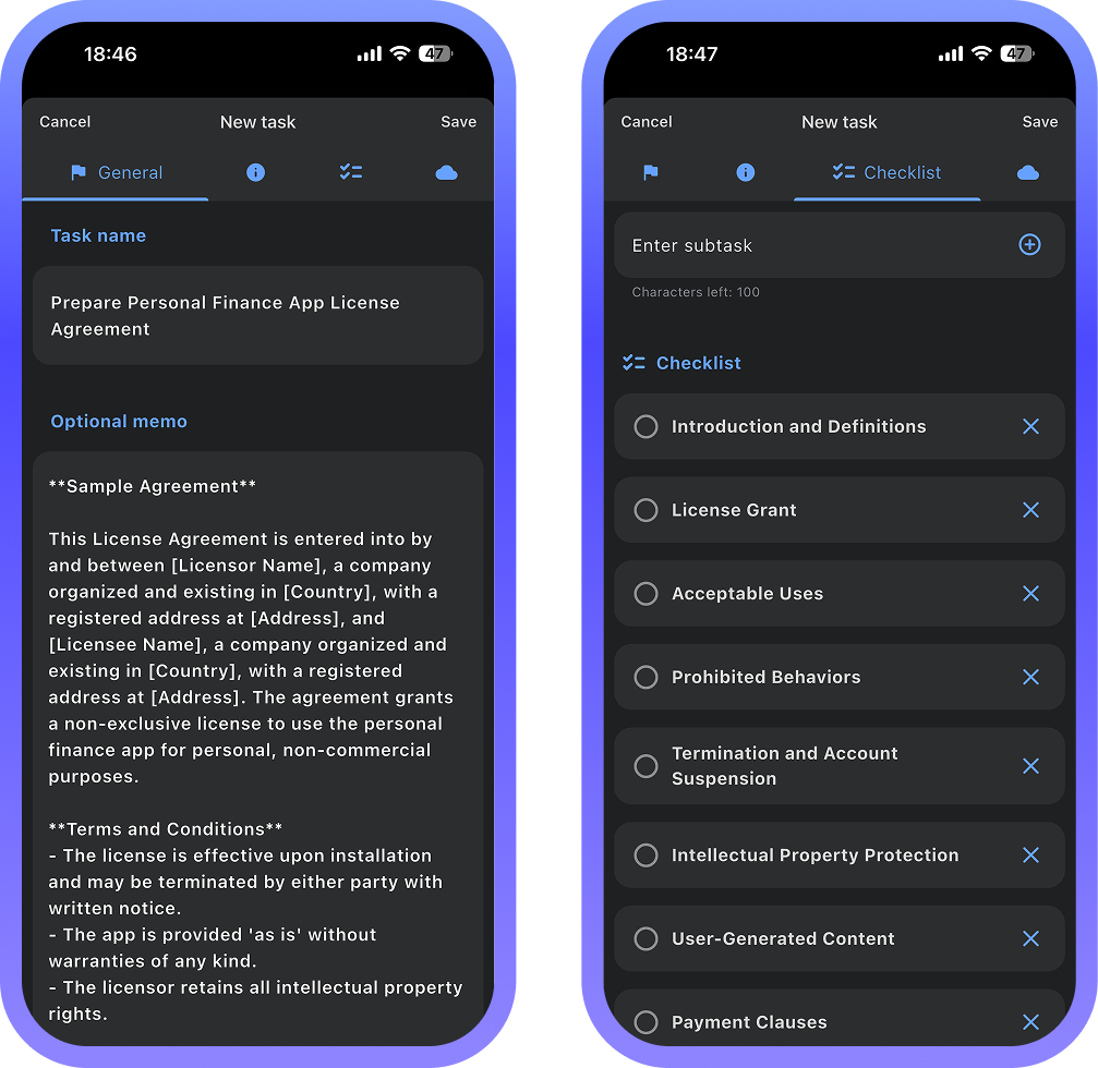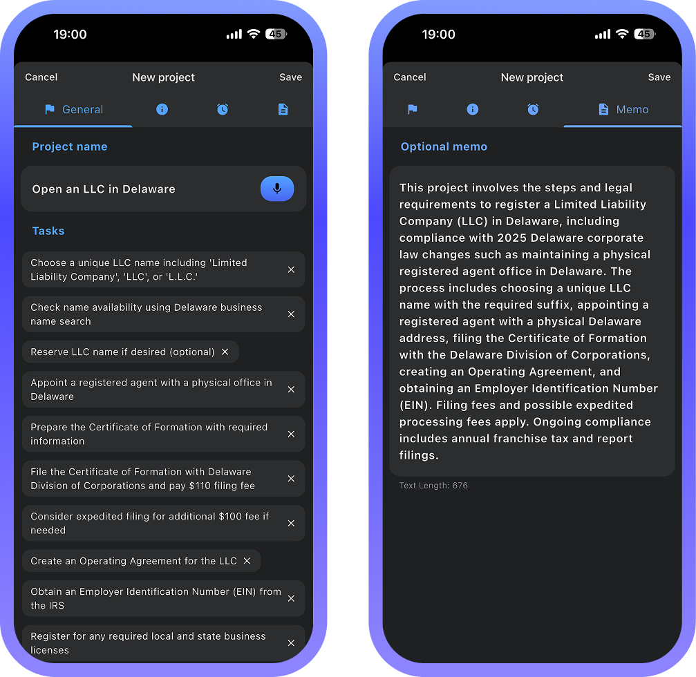 Let’s imagine the following scenario: you need to prepare a document and don’t know where to start. With the new AI voice recognition feature, you can simply ask "Prepare a license agreement for my personal finance app and populate it with a checklist of required sections. Also add the sample agreement in the Memo section of the task. Oh, and set a deadline for Tomorrow, 5 pm".