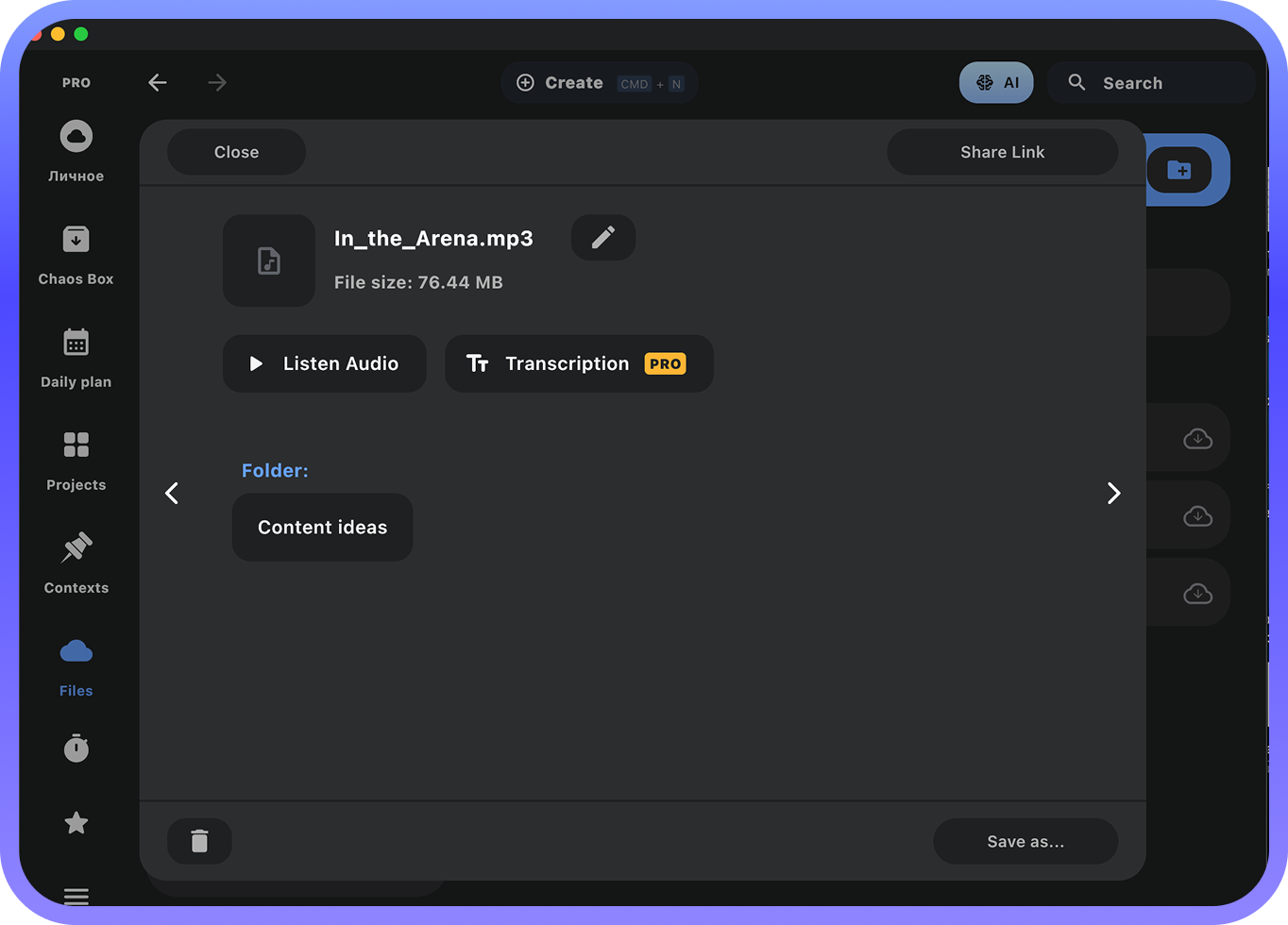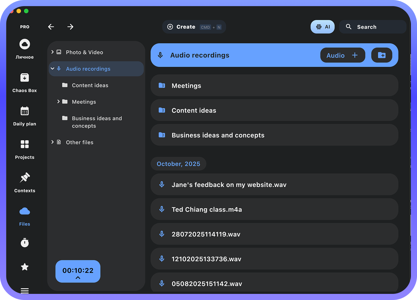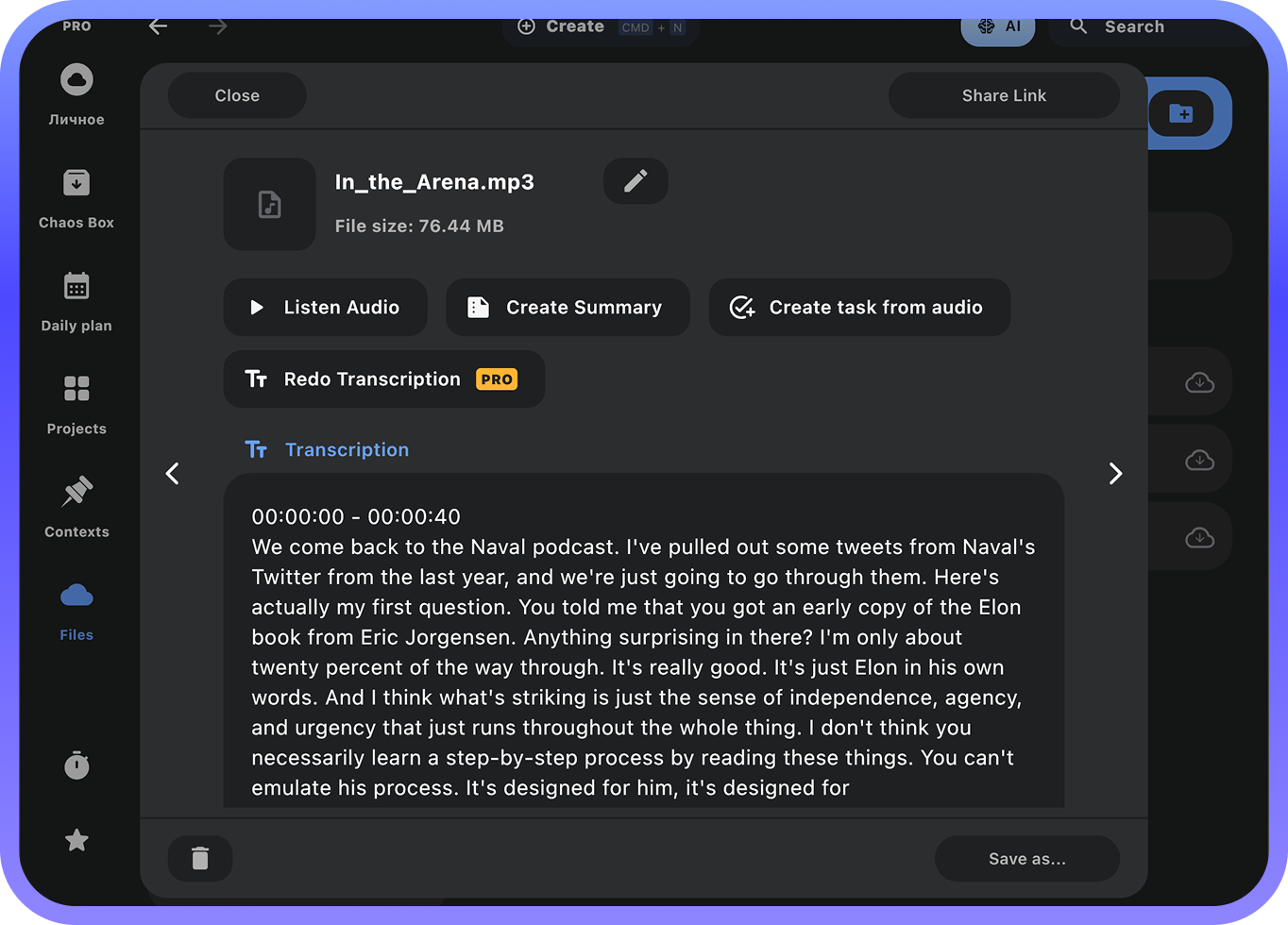 The most common scenario goes like this: let’s say you’ve got an idea but don’t have time to write it down. Just launch the audio recording using Chaos Control widget (or inside the app itself) and talk it out: