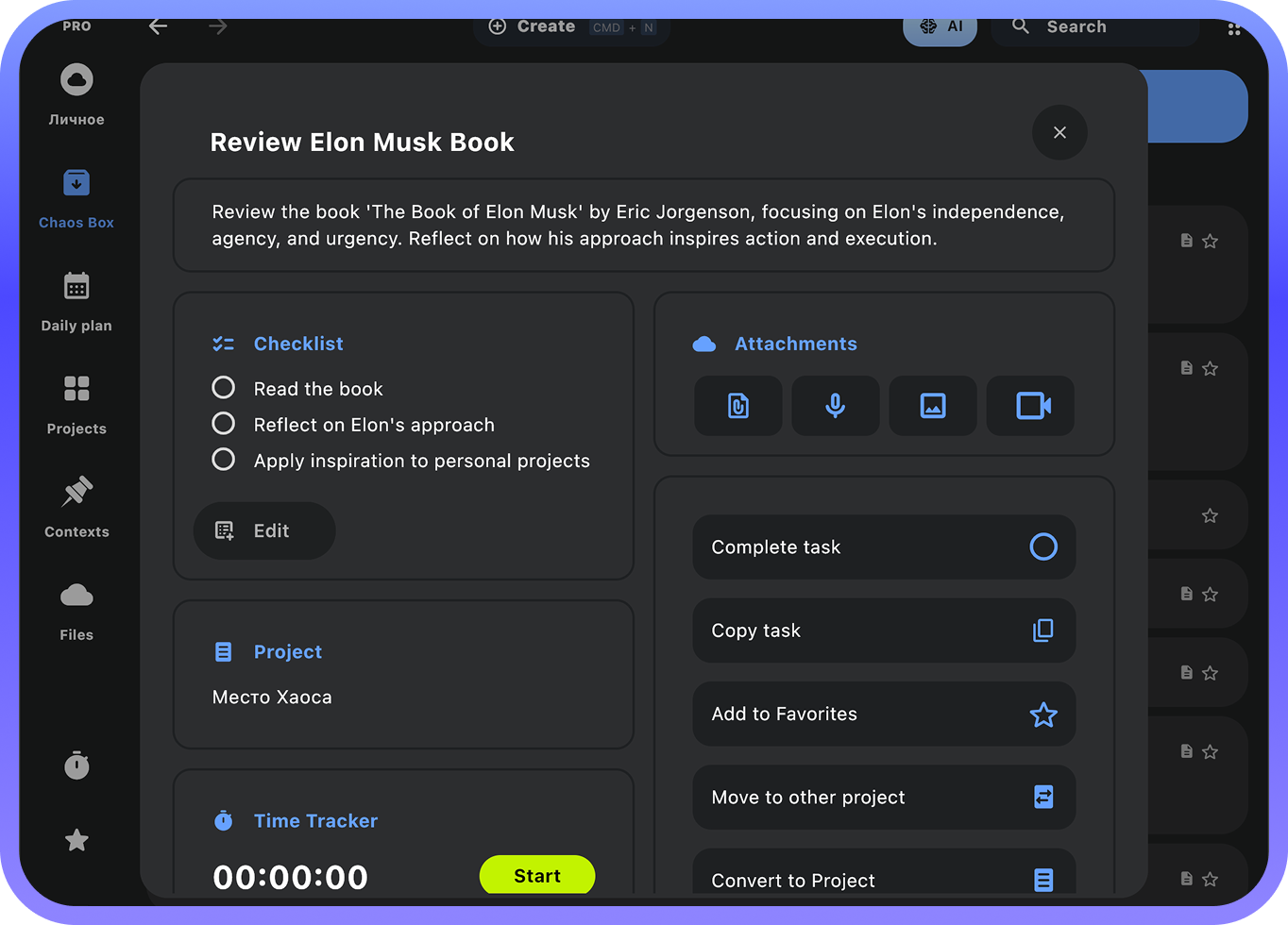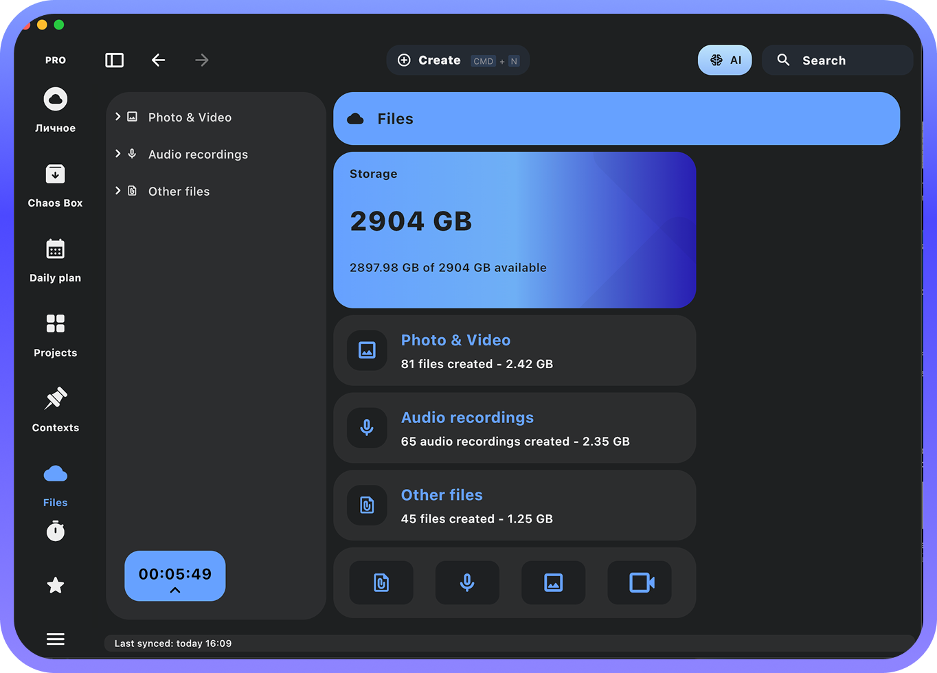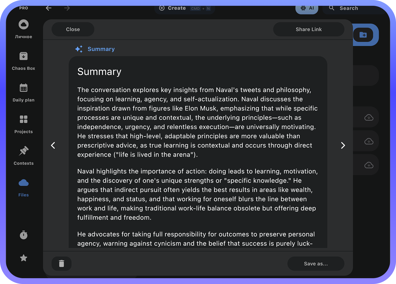 The most common scenario goes like this: let’s say you’ve got an idea but don’t have time to write it down. Just launch the audio recording using Chaos Control widget (or inside the app itself) and talk it out: