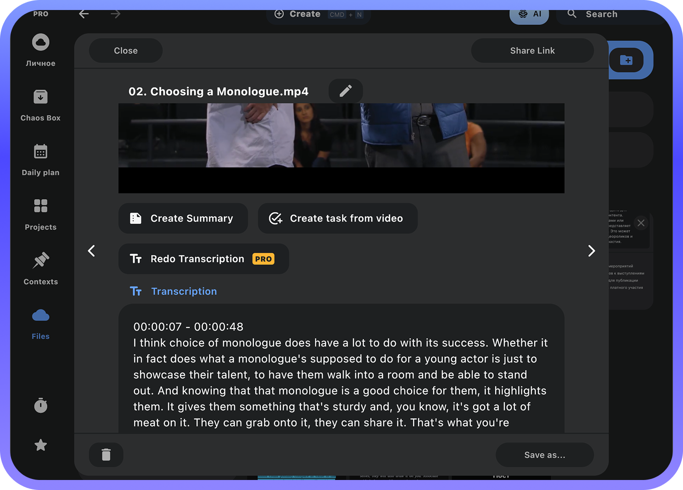You can copy the transcription and improve the text for further work if you need to. But Chaos Control provides you with three additional options: