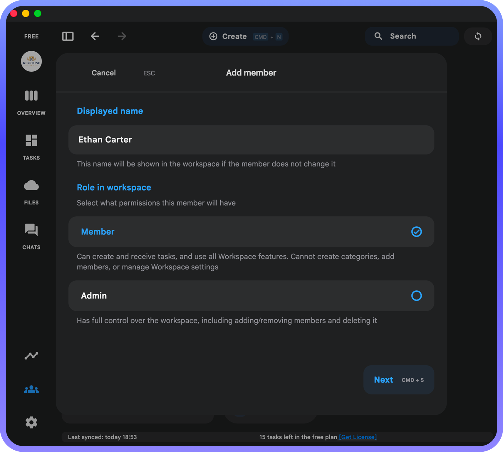 Click the "Add Member" button, enter their name, and select their desired role in the workspace. The app will then display an invitation code — simply copy it and send it to the person you want to invite: