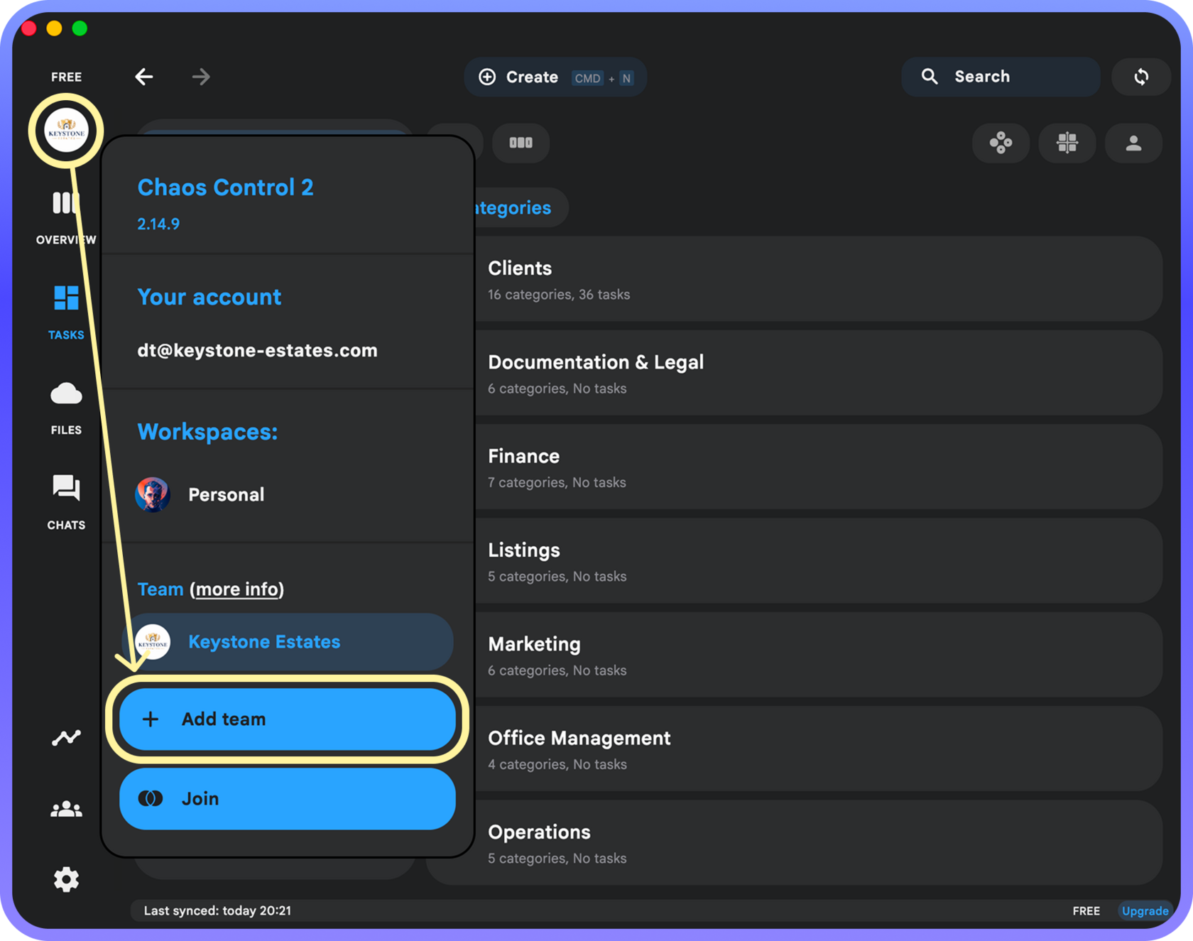 To create a Workspace, click on your profile icon in the top left corner on PC/Mac and press the "Add Team" button in the dropdown menu: