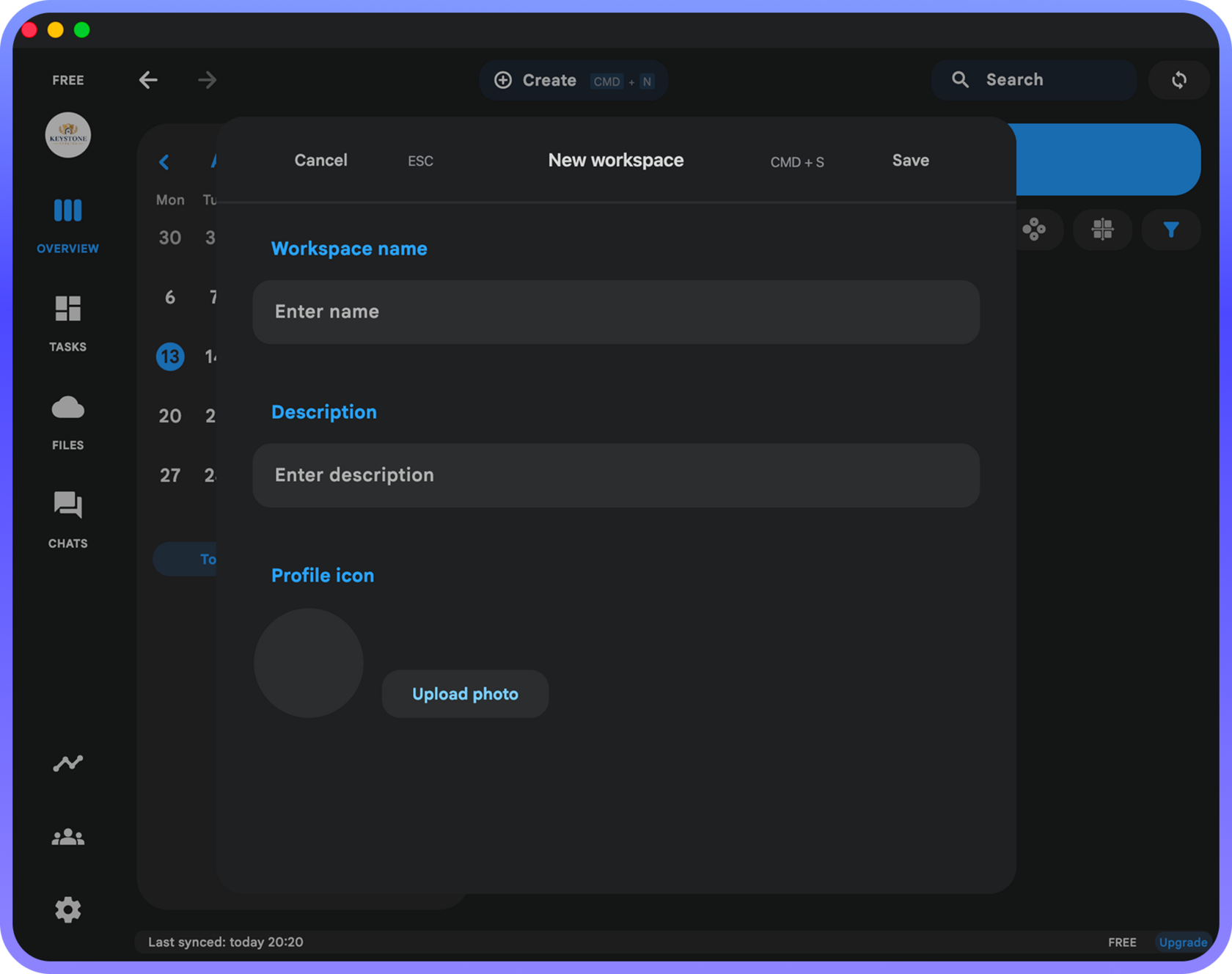 In the dialog that appears, fill in the Workspace name and description. Optionally, you can add an icon:
