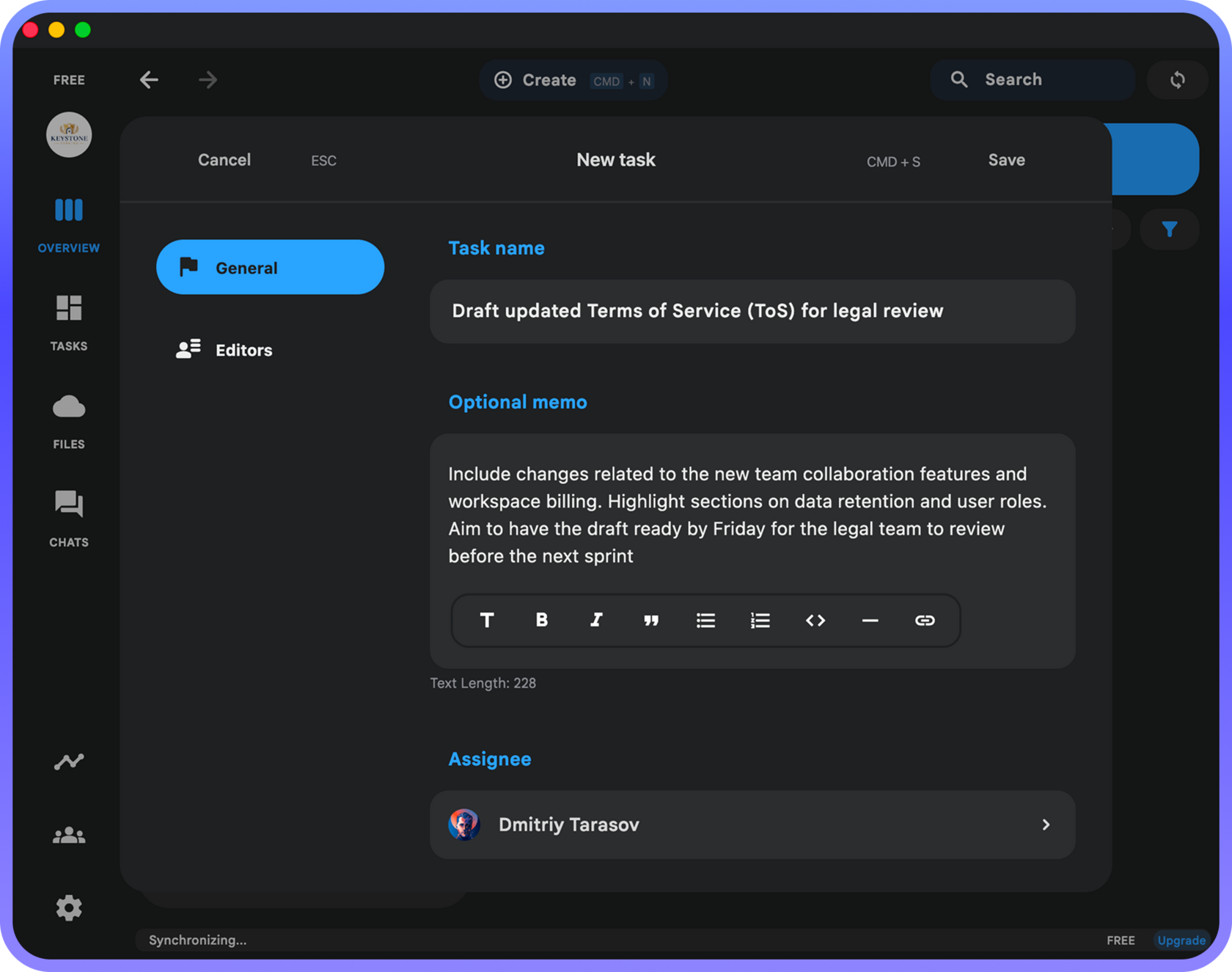 To assign a task to a member, simply click the + button. A task creation dialog will appear where you can enter a description, set a due date, and select an assignee: