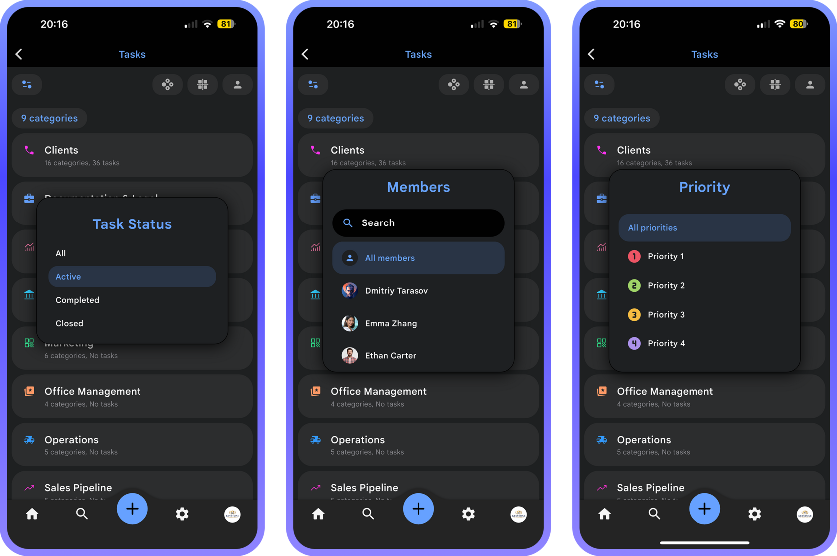 The "Tasks" section allows you to filter the task list by status and by member: